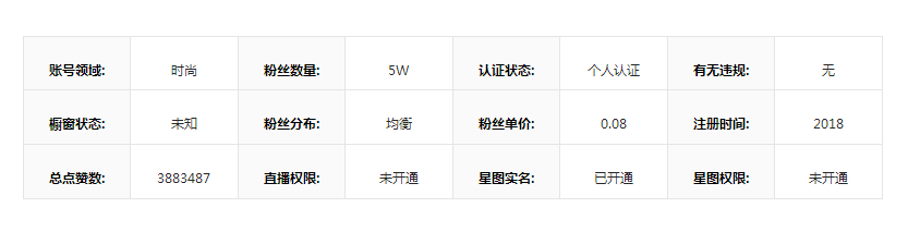 该时尚类抖音号怎么出售?抖音实名号时尚类5W。账号注册时间为2018,截止目前已经有5W的粉丝量,粉丝单价在0.08左右,粉丝偏向为,认证方式为个人认证。